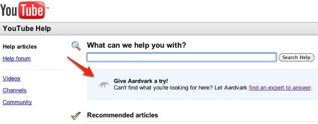 Visit the YouTube Help page and you’ll notice a prominent link prompting users to “give Aardvark a try!”. Click that link, and you’re taken to the Aardvark homepage. Google has put an identical message on the Help page for Google Toolbar. No, it isn’t exactly deep integration, but it’s still an interesting move by Google, which has never been known for its customer support.