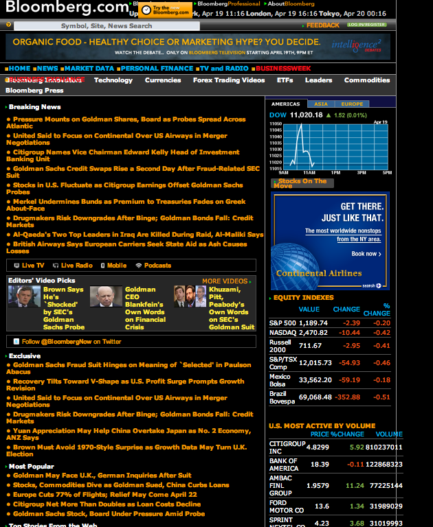 There aren’t a lot of news sites with black backgrounds for the simple reason that it isn’t easy on the eyes (not to mention it is ugly). But that hasn’t stopped Bloomberg from taking its signature look from its old-style terminals to the Web. Its site sports garish gold headlines on a black background (see second screenshot below).