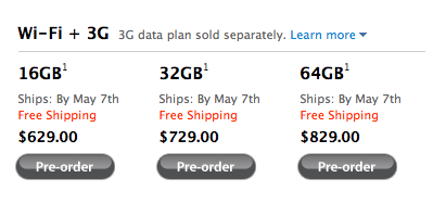 Apple in the US has updated its online store today, adding a shipping date and pre-order buttons for the different versions of the iPad 3G. And it looks like Americans will be able to lay their hands on the the 3G variant of the device “by May 7th”. As with the Wi-Fi model, each customer is currently able to pre-order a maximum of just two iPads online.