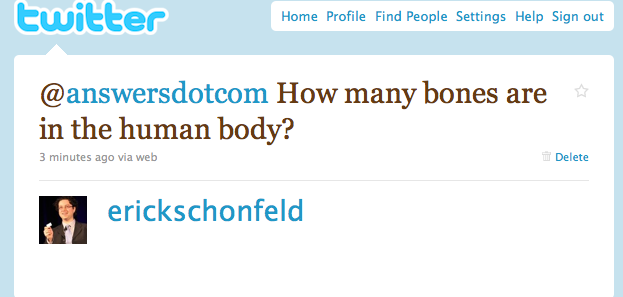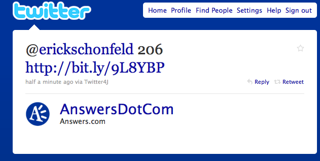 One of the biggest Q&A sites on the Web, Answers.com, now offers answers to anyone who Tweets a question to @answersdotcom. (The @answers account is owned by Mahalo, which has its own rival social Q&A service on Twitter which routes questions to humans). When you Tweet a question to @answersdotcom, you get a reply almost immediately which is the top answer from the site, or from WikiAnswers, which it also owns.