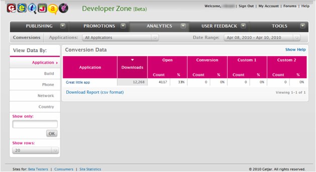 App store GetJar has released a new conversion tool to help developers of all open platform stripes track user engagement. It’s a simple, automated process that tells developers whether a user who downloaded an app has actually opened and engaged the app. All that incoming data can then be broken down by phone, country and even network, becoming a potentially powerful diagnostic tool for developers who need to know how their apps are operating across various devices and networks.