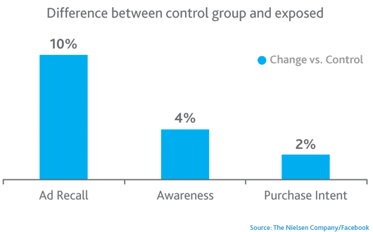 Nielsen found that the first type of ads on average generated a 10% increase in ad recall, a 4% increase in brand awareness and a 2% increase in purchase intent among users who saw them compared with a control group with similar demographics or characteristics who didn’t.