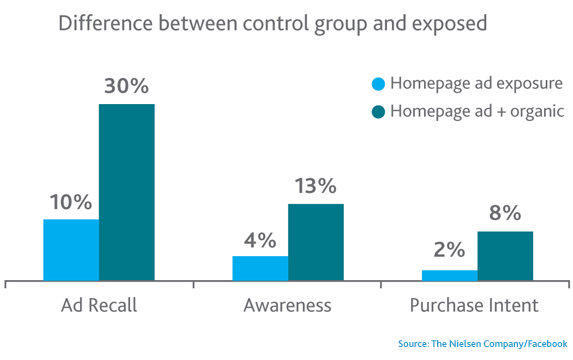 Intent for purchase climbed 2% higher among viewers of homepage ads vs. non-viewers but went up 8% either from social ads or when ads appeared alongside organic mentions of the brand in the news feed. Brand awareness went up 2% from just a homepage ad, 8% with a social ad and 13% when a homepage ad appeared along with a mention of friends who were brand fans in the users’ newsfeeds.