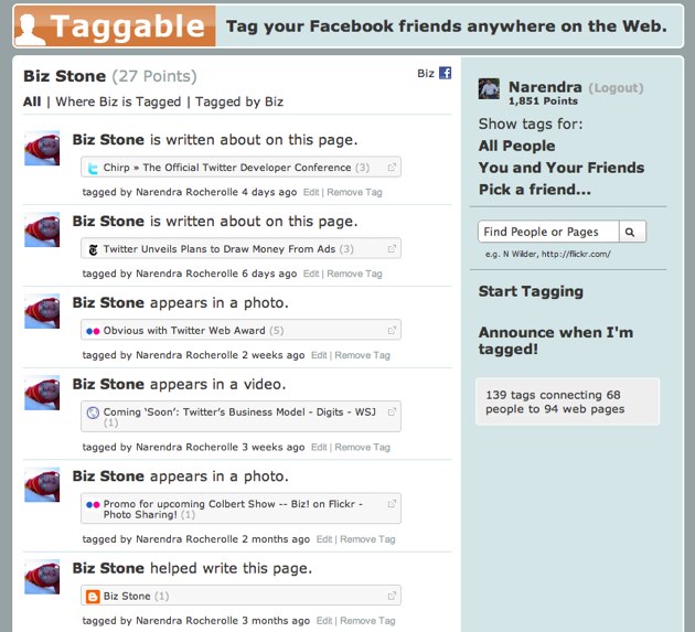 You know how you can tag your Facebook friends in pictures and pages on Facebook? Taggable extends that out to other websites as well. Want to tag a picture of your friend that’s on Flickr? Use the Taggable bookmarklet, sign in via Facebook Connect, and tag away. A link to that photo will then be published in the news stream of those users (just as it does when you are tagged on Facebook directly).