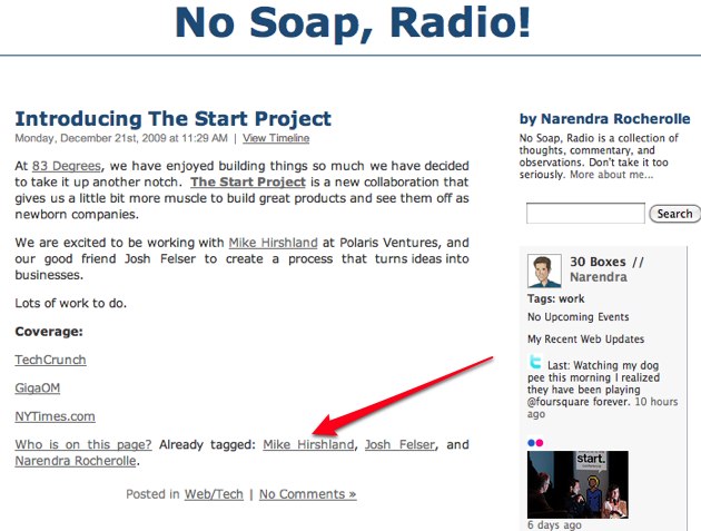 Taggable isn’t just limited to users with bookmarklets added to their browser. Publishers can also add the feature to their sites. For blogs and photoblogs it’s particularly useful becasue people you may be friends with could be in the content. Tag ’em and move on. They’ll probably appreciate that you’re organizing their personal data for them. High fives all around. Here’s a sample blog post showing user created Facebook tags at the end.
