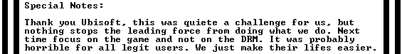 You know how in Facebook, there’s no “dislike button”? Well think of that in this case: I’m not “liking” or supporting piracy, but consider this post a continuation of our “dislike” of Ubisoft’s faulty, ridiculous DRM scheme. Said DRM has prevented thousands, perhaps millions, of legitimate buyers of the game from playing it — and now, a leading group of hackers has put together a solution that rids the game of the DRM scourge.