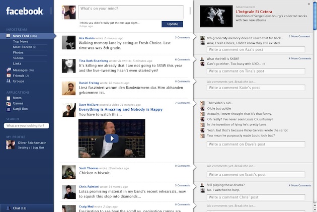 And then I see something like this. From 2006 to 2007, the design group, iA, was in touch with Facebook about doing a redesign. Facebook didn’t end up using their stuff, but iA recently decided to take what they had done and update it to work with the way Facebook is currently laid out. The results are excellent — much better than the way Facebook actually currently looks.