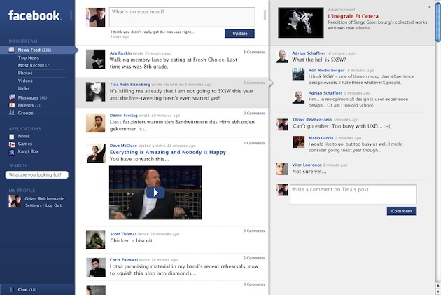 Sure, it’s a bit Outlook-inspired, but wow do I wish I could navigate Facebook this way. The stream? Nice and clean, most elements are the same size (like Twitter) because comments are shoved into a new column on the right (and collapsed to show only 2 by default). And that comment column looks much, much better because it’s not surrounded by those ugly blue square backgrounds that currently make a complete mess of the stream. And there are in-line replies.