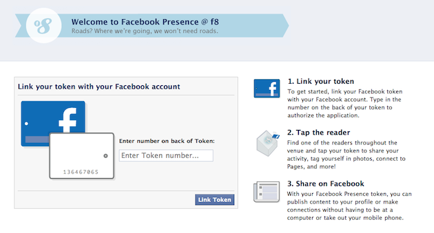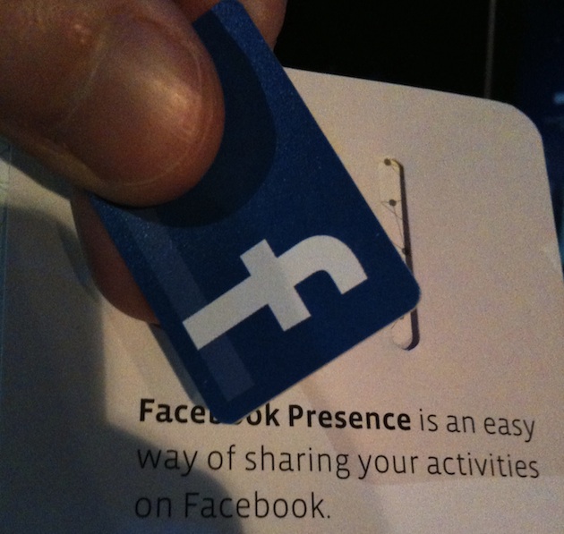 Today at Facebook’s f8 conference in San Francisco, the company have given all attendees a small RFID tag attached to their conference badge. This tag is a part of something called “Facebook Presence” which allows you to “check-in” at various places around the conference simply by swiping your badge. Yes, it’s location.