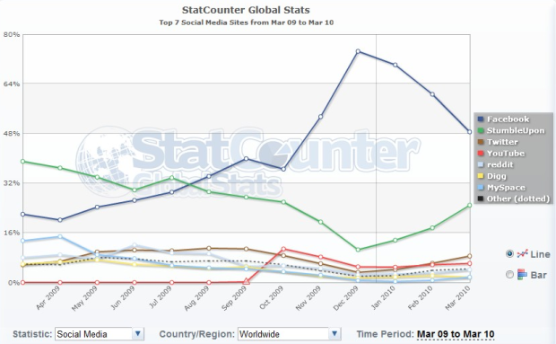 The data for March 2010 is said to be based on 13 billion page views across the global StatCounter network of member sites. The company only recently added social media services to its GlobalStats tool, and notes that its market share appears to fluctuate way more than browser or search statistics.