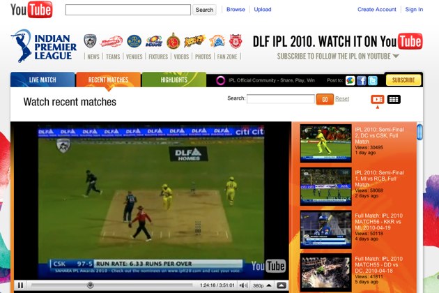 When the IPL deal was first signed it granted YouTube live streaming rights for every country except for the United States, where matches have been posted fifteen minutes after they ended. However, YouTube is streaming both the semi-finals and finals live (we’re told YouTube’s biz dev people worked “around the clock” to make that happen). All of which means the final view tally is going to be way more than 10 million.