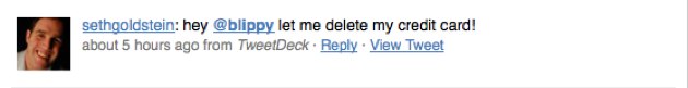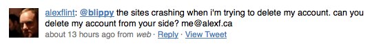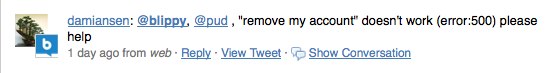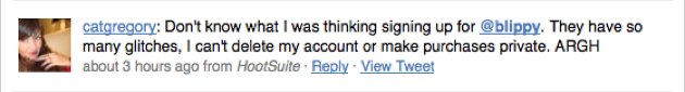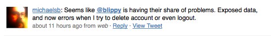 Elsewhere, Blippy wins points for reaching out to affected consumers (the founders personally called the owners of the compromised accounts). But once again, the company loses a few points, for failing to publicly address customer service issues on Friday. In the wake of the NYTimes coverage and the crisis, Blippy’s servers were stressed. For some users, who were looking to close their accounts, that led to error messages and frustration, as evidenced on Twitter: