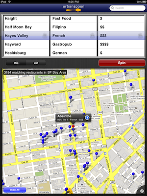The app, which just went live in the App Store, looks beautiful. It’s like the iPhone version except there is a persistent map below the regular “slot machine” area where you pick and choose (or have the app pick and choose) your options for food. Once you make your selections, you can either hit the red “Spin” button or shake the iPad — yes, just like the iPhone. The choices will be highlighted on the map. Or you can choose a “List” view which then shows the details about each place, including their UrbanSpoon rating.