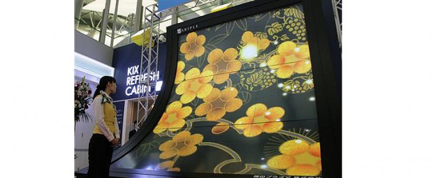That right there? Yeah, it’s the world’s largest curved plasma screen. Betcha you didn’t even know that plasma screens could be anything but flat. I didn’t. This fine screen measures 200-inches and was unveiled yesterday in Japan’s Kansai International Airport Departure Area to clearly remind travelers that no matter where they go, no place does technology like Japan. That’s mean. Click through to embiggen the pic.