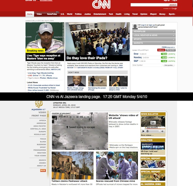 Why do we have to look enviously at the front page of Al-Jazeera English for a better sampling of important news stories at any given time? If the CNN frontpage is a reflection of consumer demand, are we to believe that their readers demand real journalism?