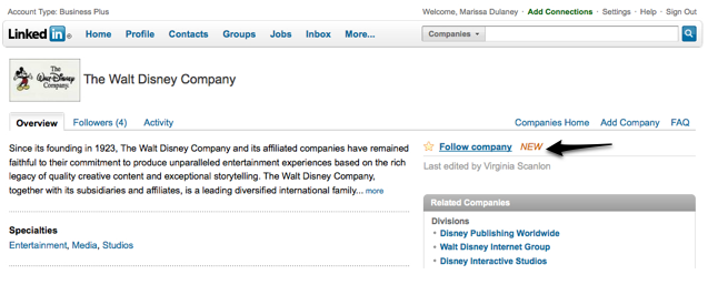 So now, any LinkedIn user can follow a company on the network, and will receive real-time alerts from the profile in their news and activity stream. It’s very similar in theory to the act of “following” someone on Twitter of becoming a fan of someone on Facebook.