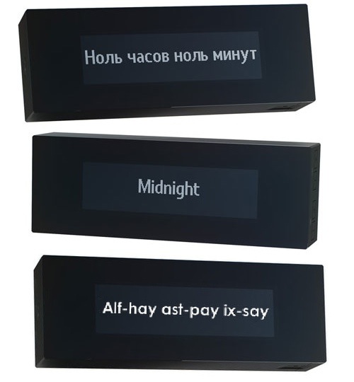 Back to the clock. It spells out time in a way not unlike FuzzyClock, which I don’t find useful, though I do understand the attraction. You can load up the Verbarius with any language and it’ll happily spell it out. I’d go with piglatin, and then insist that it’s French and I should know because I speak fluent French, have been for years, etc etc. Oh, gadget jokes. Not the funniest.