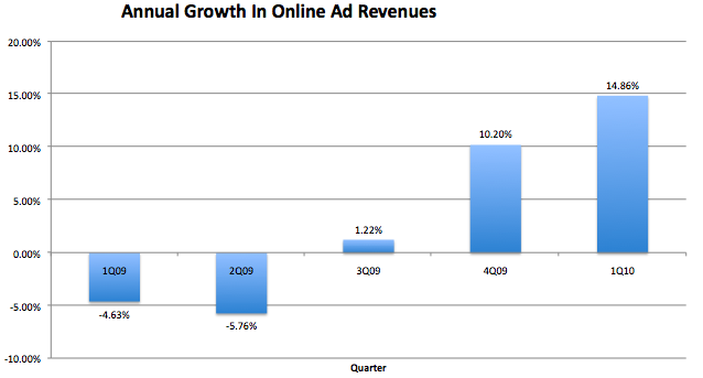 The online advertising industry saw growth accelerate in the first quarter, with the combined advertising revenues of the four largest players (Google, Yahoo, Microsoft, and AOL) jumping almost 15 percent to $8.8 billion. This compares to 10 percent annual growth in the fourth quarter, and negative growth the first two quarters of last year (aka, the Great Advertising Recession of 2009).