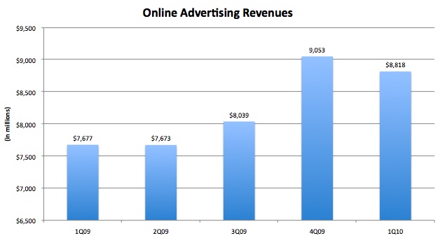 I keep track of these numbers every quarter for these four companies, which turns out to be a good proxy for overall online advertising revenues since they represent a majority of the industry’s revenues. The numbers represent global advertising revenues, and include network revenues paid to affiliates through AdSense and Yahoo’s ad network. Google’s licensing revenues for Google Enterprise Apps have been stripped out. For Microsoft and AOL, I include only the advertising portions of their online revenues as reported in their quarterly earnings statements.