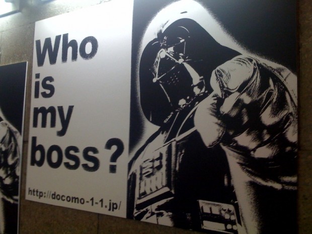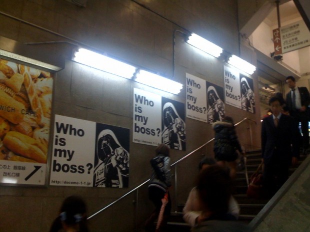 NTT DoComo, Japan’s largest cell phone carrier (55 million customers), is currently running a pretty bizarre viral promotion campaign in this country (both on- and offline). The company has set up a weird website [JP] that, for some strange reason, shows Darth Vader running around Tokyo and asking who’s his boss (“Who is my boss” is the official tag line of the campaign).