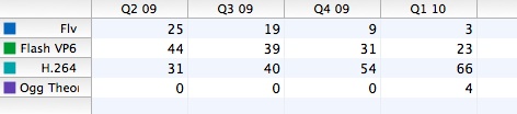 So how much video exactly is available in H.264? I asked Encoding.com, which has encoded 5 million videos over the past year for a variety of Websites and customers including MTV Networks, WebMD, Brightcove, Nokia, MySpace, and Red Bull. President Jeff Malkin sent me the chart above, which he believes is representative of the Web in general, including mobile. As the chart shows, in the past four quarters, the H.264 format went from 31 percent of all videos to 66 percent, and is now the largest format by far. Meanwhile, Flash is represented by Flash VP6 and FLV, which combined represent only 26 percent of all videos. That is down from a combined total of 69 percent four quarters ago. So the native Flash codecs and H.264 have completely flipped in terms of market share (Flash also supports H.264, however, but you don’t need a Flash player to watch H.264 videos)