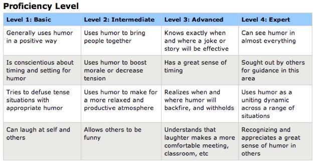 But what is undeniably fucking hilarious is Microsoft trying to break down humor into a handy table with four levels of proficiency so that people can learn to be funny and use that skill in the workplace.