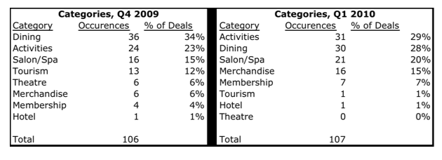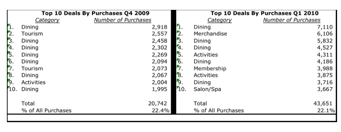 If you look at the top 10 deals by number of purchases, local merchants appear to be getting more comfortable with the Groupon marketing channel. Restaurant coupons will also be popular but offers like discounted clothing, flowers, house cleaning, and local events like boat shows are increasingly appearing on the site. As you can see below, between the fourth quarter of 2009 to first quarter of 2010, “Activities” replaced “Dining” as the #1 category and “Merchandise” took a big jump. My guess is that this will become more prevalent as Groupon increases its salesforce and these more local merchants begin to experiment with unique offers. Consumers will benefit as they have the opportunity to grab more of their favorite things at deep discounts.