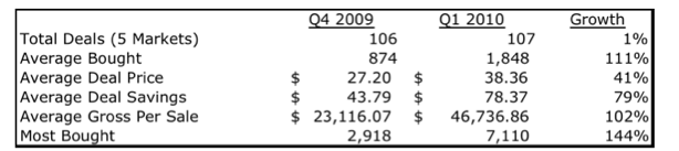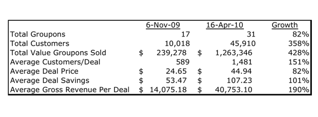 On April 16, 2010, Groupon had 31 deals, 45,910 paying customers and sold nearly $1.3 million worth of coupons. This was a significant increase from the 17 deals, 10,018 customers and $240,000 in gross sales it had on November 6, 2009. Along every measurement I looked at—the number of deals /day, average customers/deal, average deal price, average gross revenue/deal—Groupon is seeing tremendous growth. Of particular importance is that its average deal price is increasing (from $24.65 to $44.94) and it is rapidly opening up new markets.