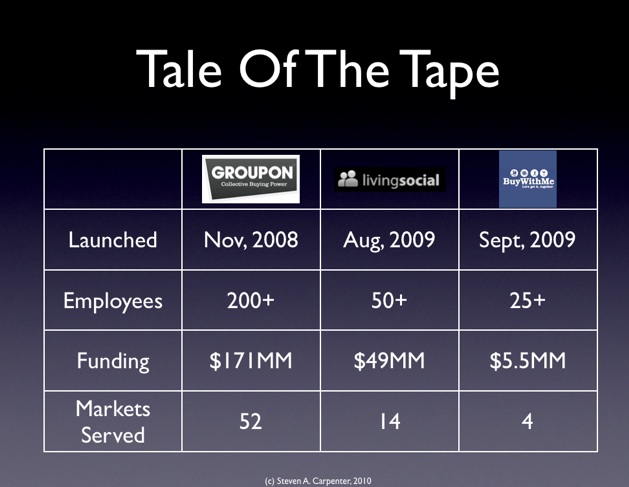That said, my take is that this is a winner-take-most market and looks more like search, where the bulk of the revenues will fall to the leader. There are definitely network effects in play and they appear to be stronger than I initially assumed. When Groupon enters a new market it is starting from scratch but it can leverage its significant investment in its platform. This is the reason it has raised so much capital and it is racing to get into new cities before the competition. The question remains whether fast followers like LivingSocial and BuyWithMe will be able to grow into mini-Groupons with Groupon already firmly entrenched in a city.