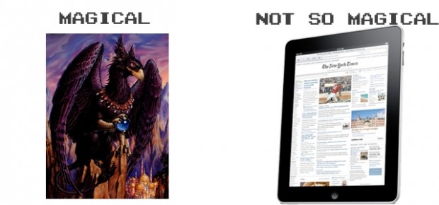 In doing a survey of history, a few things could be called “magical and revolutionary” products. These include, but are not limited to, Pegasus, pasteurized milk, the polio vaccine, Apollo 11, and that blue stuff you put your combs in at the barber. And, as much as I like the iPad, I feel that Apple’s dedication to the “magical” party line is a bit disingenuous.