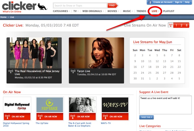 Online video guide Clicker is taking a stab at that with the launch of Clicker Live. It is starting with thousands of feeds of premium live video on the Web. The clicker site will have a new Live tab where live shows will be promoted as “On Air Now” and can be searched. There is also a calendar showing what’s coming up, and you can browse by topic or title. Here are some examples of the types of shows and live video streams that will be indexed on Clicker Live: