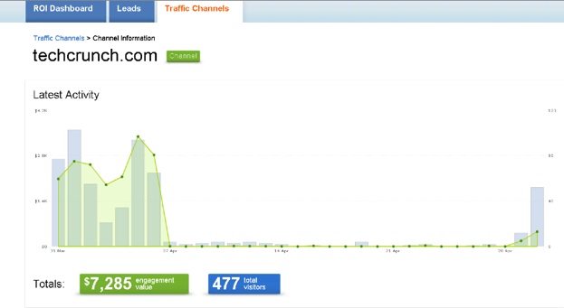 It also lets you drill down by site and see the traffic from that site along with the overall engagement value by site, with the idea that marketers can use the data to target their advertising to those sites which deliver the most value. An online kitchen retailer might discover that a particular cooking blog delivers much more engaged visitors and potential purchasers than a bigger recipe site, for instance, even though the number of visitors may be smaller. The screenshot below shows the estimated engagement value of TechCrunch to Sysomos over the past month.