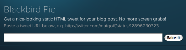 As we noted yesterday, Twitter has launched its new tool that allows you to easily embed tweets into a website or blog post. The tool, called Blackbird Pie, is a website that simply asks you for the URL of a tweet. Once you copy that in and hit “Bake it,” you get back a preview of how it will look on the web, and a box with the code you need in it.