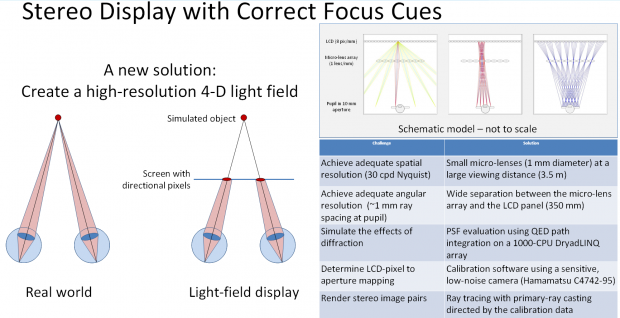 The idea is that instead of having the eyes looking at the screen and attempting to focus nearer or further from it, a microlens array is interposed, which refracts the light in such a way that the eye would be able to focus on where the displayed object would actually be. Here’s the full slide:
