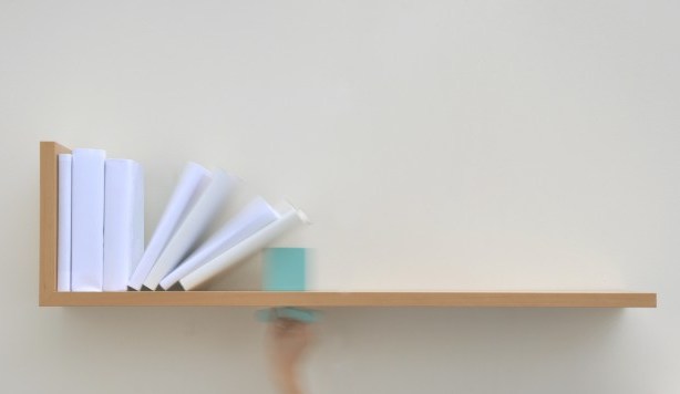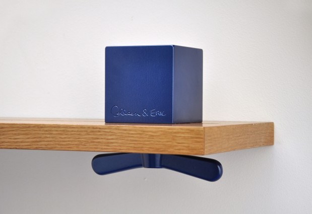 It’s called Hold on Tight, created by Brooklyn designers Colleen and Eric. The wing nut on the bottom tightens or loosens the cube, which you can slide back and forth to keep your books snug (or leaning at a jaunty angle). Great, but that cube is pretty gigantic. Maybe they could put out something with a more subtle look?