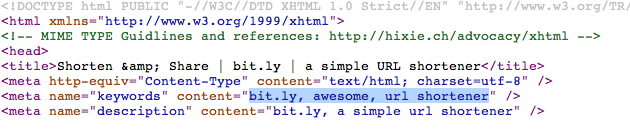 So it definitely seems like they wouldn’t need to resort to some silly meta keyword tactic to try and draw in web surfers searching for their rival. And yet, there’s the word in the code, clear as day. There are only three keywords Bit.ly has included in the header, “bit.ly, awesome, url shortener,” two make sense, one does not.