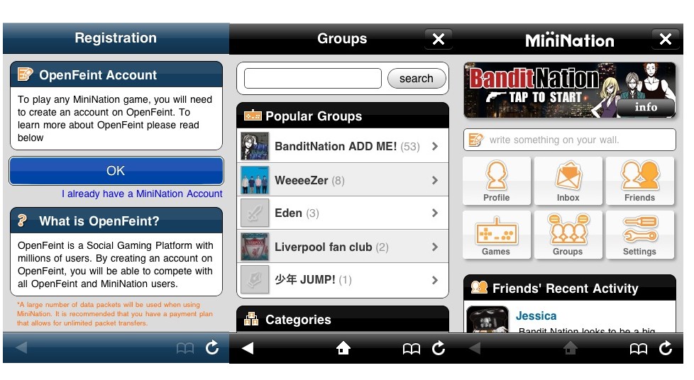 MiniNation allows users to exchange mails, post messages on each other’s walls, create communities, befriend others etc. It’s also integrated with the OpenFeint platform for iPhone games (DeNA owns a 20% stake in OpenFeint provider Aurora Feint).