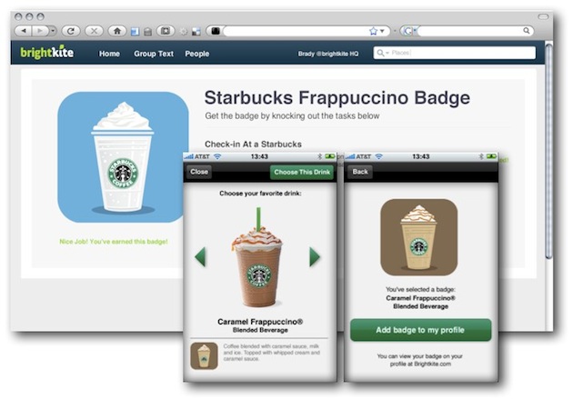 So what’s the deal? Brightkite doesn’t want to give away all the details at the risk of ruining some surprises, but one aspect is that if you check-in (or post something like a note or image) at a local Starbucks during “Frappuccino happy hour” (that is, 3 PM to 5 PM until May 16th), you’ll get half-priced Frappuccinos. You’ll also unlock other features and rewards, including Frappuccino badges that you can pin to your profile.