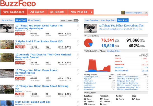 Peretti plans to use the new money scale up BuzzFeed and launch a new self-serve product that will allow publishers and brands to try to manage their own viral buzz campaign. Up until now, BuzzFeed has managed each campaign on a custom basis and experimented to see what kind of strategies work. It offers free Buzz analytics which lets Website track the viral spread of their own content. On the viral promotions side, BuzzFeed tries to detect early when consumers start to pick up and share content and then promote that through different channels, including BuzzFeed.com itself (which has about 3 million monthly unique visitors in the U.S.) and the larger BuzzFeed network through widgets on Websites and other means. The ultimate win, says Peretti, is when an “advertiser gets on front page of Digg, Twitter and gets all of this organic traffic for free.”