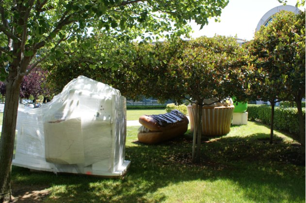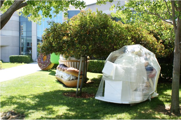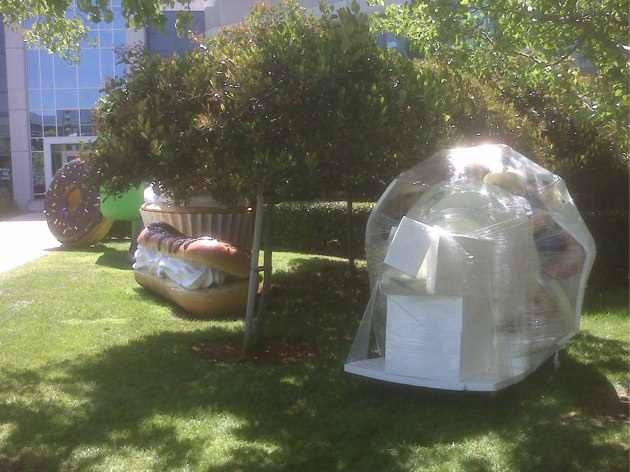 Pictures we now have, but the sculpture is sadly still wrapped in saran wrap. Boychenko was instructed to remove the saran wrap to get a better picture, but she was stopped by diligent Googlers: “Some [Googlers] threatened to call security when I tried to unwrap the saran wrap.”