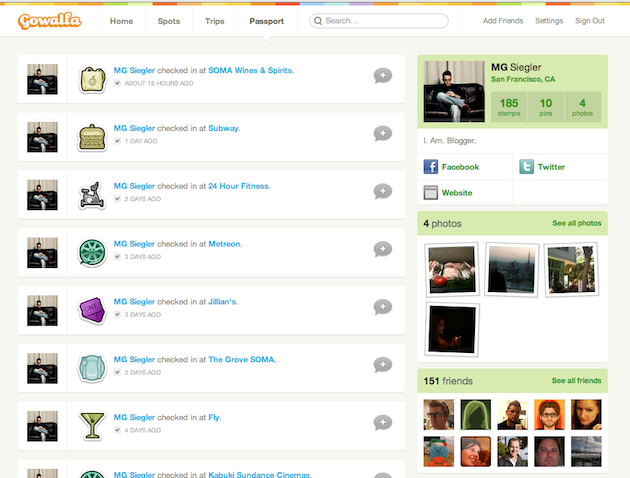First, the site itself looks great. While Gowalla rolled out a revamp just prior to SXSW in March that looked pretty good, this new one is better. The reason is that it greatly simplifies things down to the core of the service. That is, the check-ins. For a long time, Gowalla was focusing on items you were carrying, and special pins and stamps. Now the focus is solely on your stream of check-in activity (on your profile page) and the stream of your friends’ check-ins (on the main page).