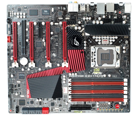 Moments ago, in our chatroom, I said that, if I had the money, I’d buy two Asus Rampage III Extreme motherboards: one to use and one to hang on the wall like a diploma. That’s how great the thing looks. Never mind that, simply reading the stats, it’s one of the best motherboard money can buy as of today—it looks as if it was designed by an extraterrestrial being, one with an advanced outer space art degree. It’s a very good board, but is it OMG BEST THING EVER~!