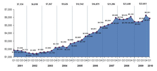 Check out the following chart, which highlights quarterly ad revenue since 2001 (note that dollar figures are rounded):