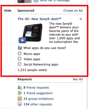 Take for example, the sponsored ad from Sony at right. It’s a sponsored poll widget I can actually interact with. Much like a mini Facebook-app it amuses me with a poll while ensuring that I interact with the brand. Innovative ad formats are rapidly evolving on Facebook as marketers figure out smarter and smarter ways to catch our attention. It’s only a matter of time before Facebook figures out how to make brand advertising useful and effective on Facebook.