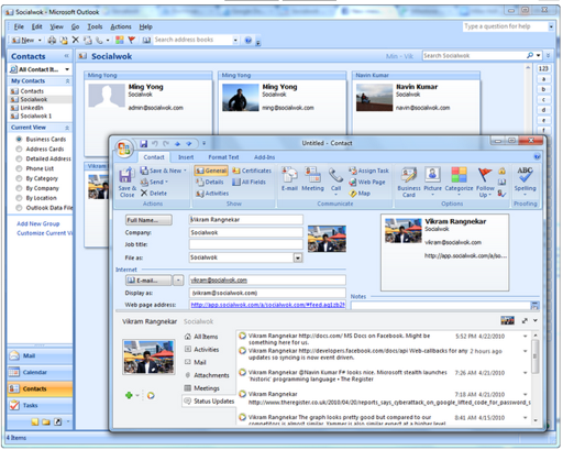 Of course, the timing of Socialwok’s connector fits with the roll out of the new version of Office 2010 this past week, which brings all of its applications, including Outlook, Word, and PowerPoint, to the PC, phone and browser. Outlook specifically has been revamped to become more social, with integration available for LinkedIn and MySpace