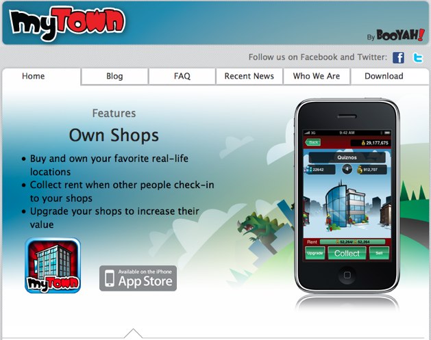 It’s not exactly fair to compare Foursquare and Booyah, Foursquare focuses on social utility, Booyah focuses on gaming, but both are trying to unlock the power of the check-in and create a massive user base. Booyah, via MyTown, is trying to merge a virtual gaming world with the real world. Users can check-in to real world locations to unlock virtual rewards, they can also “purchase” their favorite properties, collect rent from others and update their properties. Like Foursquare, you can see where your friends are checking-in and pick up local deals.