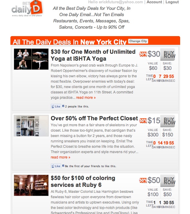 The group buying craze is now officially in overdrive. There are so many group buying sites—Groupon, LivingSocial, BuyWithMe, SocialBuy—that it is hard to know where to go for the best deals. Enter the DailyD, a new site that just launched today which pulls together all the deals for a city in one site and sends out a daily email as well.
