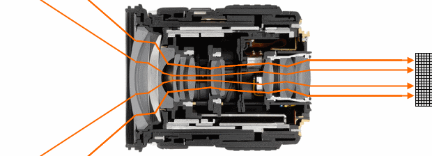 Light comes into a lens from a number of directions. Wider lenses can have light coming in from vastly different angles, and even telephotos have to deal with light hitting the lens at the “wrong” angle and creating flare and glow. Once the “right” light enters the lens assembly, it passes through a number of optic elements (discs of high-quality glass with various types of convexity and concavity), bending and re-bending the light to produce a projected image on the other side of the lens. Depending on the aperture selected, it will have a certain amount of the scene in focus, but the total light that comes out the interior end of the lens depends on the amount of light that came in the exterior end.