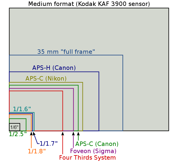 Sorry, that ended up being longer than I expected it to be. But now, if you didn’t before, you know the rudiments of the process. Now, let’s get on with the news. Omnivision, an established creator of image sensors, has created a sensor that is 1/6th of an inch diagonally that records 1080p video. To give you an idea of how large a 1/6″ sensor is, here is a very handy little chart.