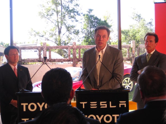 Toyota and Tesla announced a new partnership at Tesla’s headquarters in Palo Alto today, the auto makers will collaborate on technology, the development of new electric vehicles and Toyota will purchase $50 million of Tesla’s common stock (to be completed after Tesla’s pending IPO). The press conference featured the Governor of California, Arnold Schwarzenegger, Tesla CEO, Elon Musk and TMC President, Akio Toyoda.